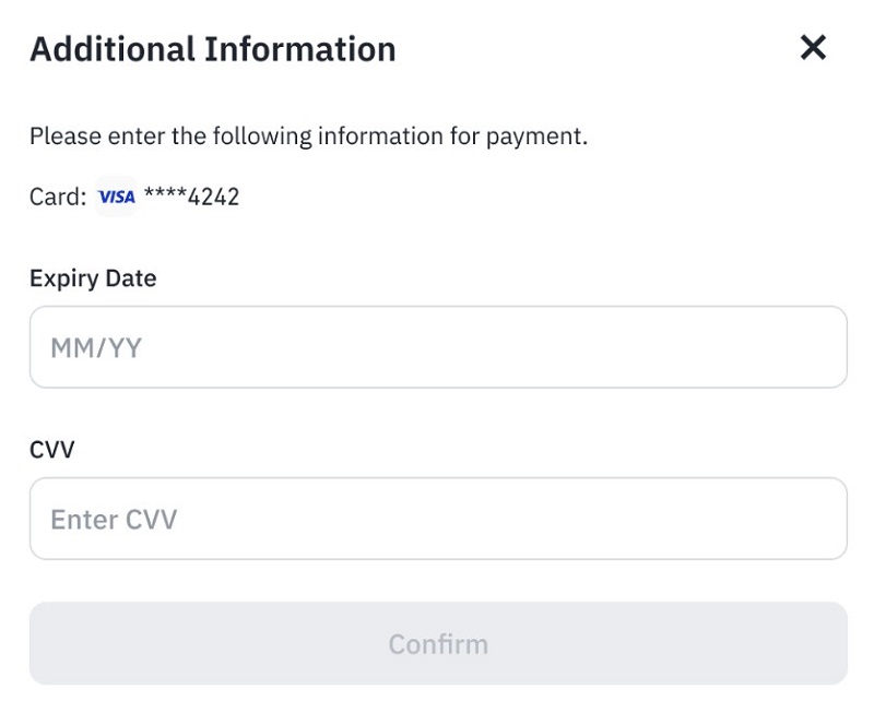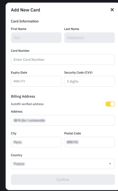 3.1.如果您之前没有使用过银行卡购买过加密货币,请点击【添加新卡】,输入您的银行卡信息,然后点击【确认】。
