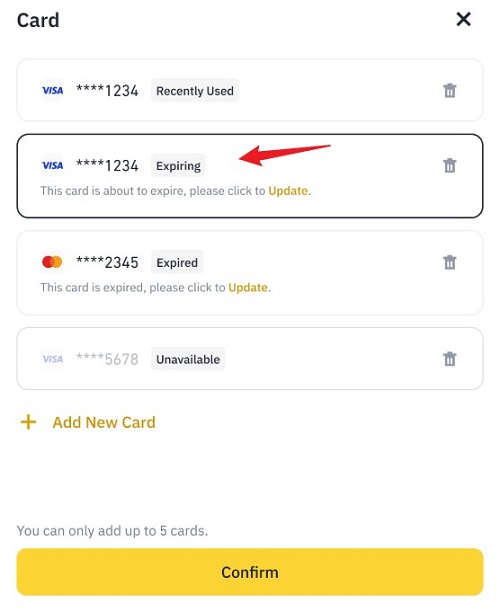 3.2.如果您之前使用银行卡购买过加密货币,请确保该卡有效。您可以在卡号右侧查看卡片状态。