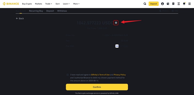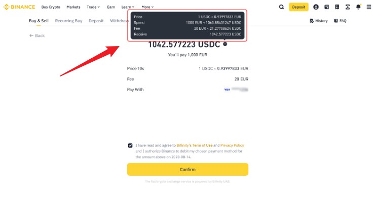 4.点击【确认】前,请仔细检查付款详情和交易费用。请注意,加密货币的价格和相应的金额可能会随时自动重新计算。