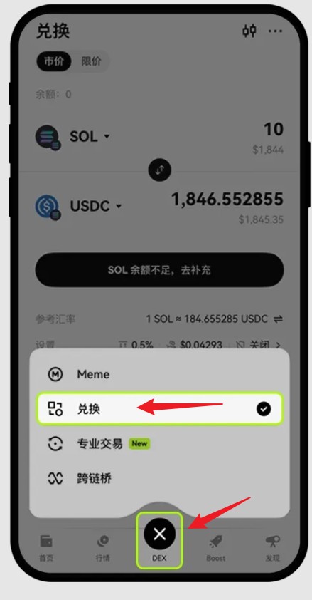 1.打开 Web3 钱包,点击【DEX】-【兑换】,上方币种是您需要支付的币种,下方币种是您接收的币种。