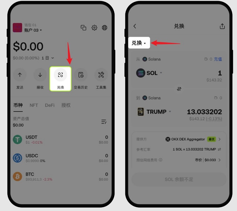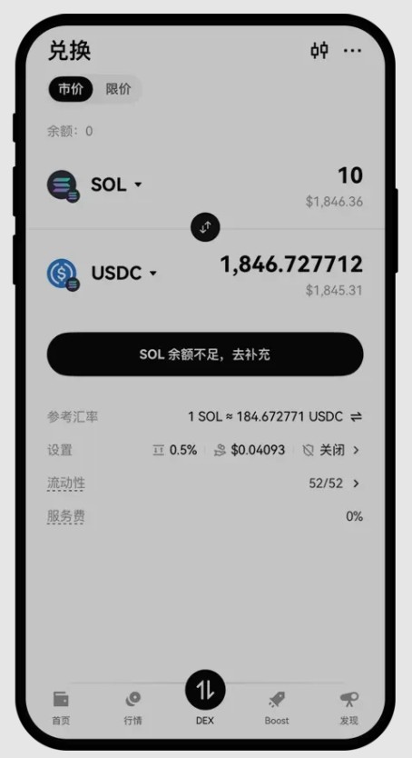 在插件钱包首页,选择【兑换】,选择网络,如 Solana,然后选择兑换的币种,输入兑换的数量,然后点击【通过 DEX 兑换】,等待交易上链即可。