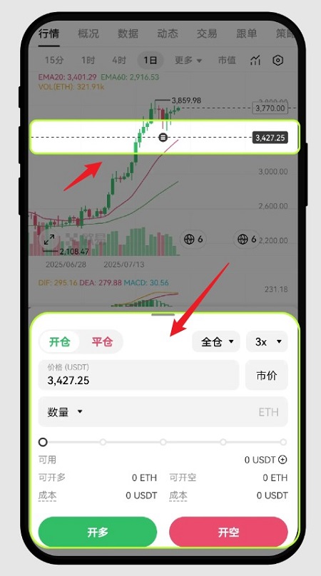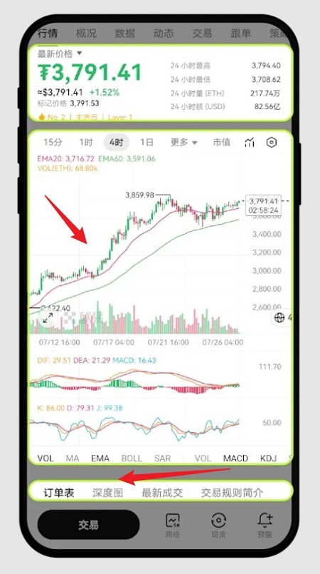 打开平台 App ,进入K线图页面,在图表主界面主要有三个区域,展示交易信息和K线图: