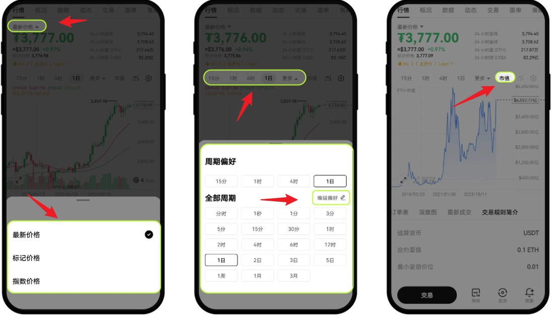 1.价格显示:点击最新价格,切换图表展示最新价格、指数价格、标记价格。