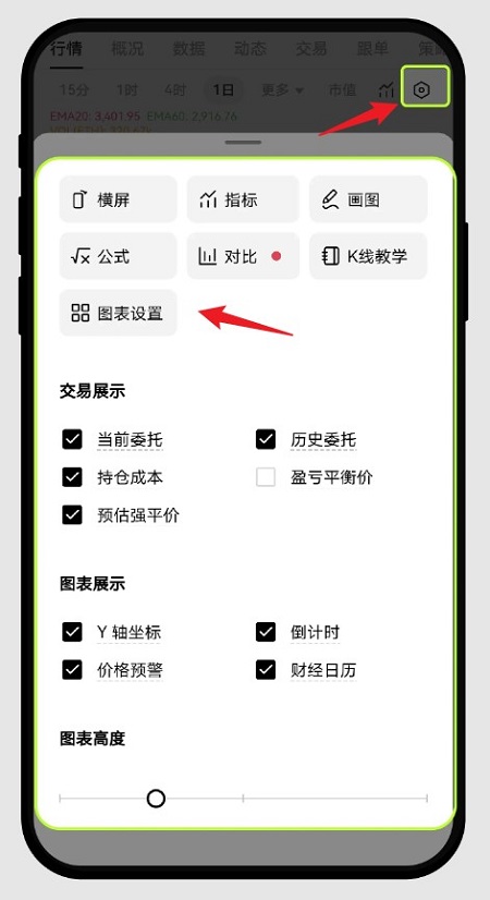 点击K线图左上角的【设置】按钮,您可以对K线图进行更多设置,如:K线图颜色、涨跌幅周期、快捷下单等: