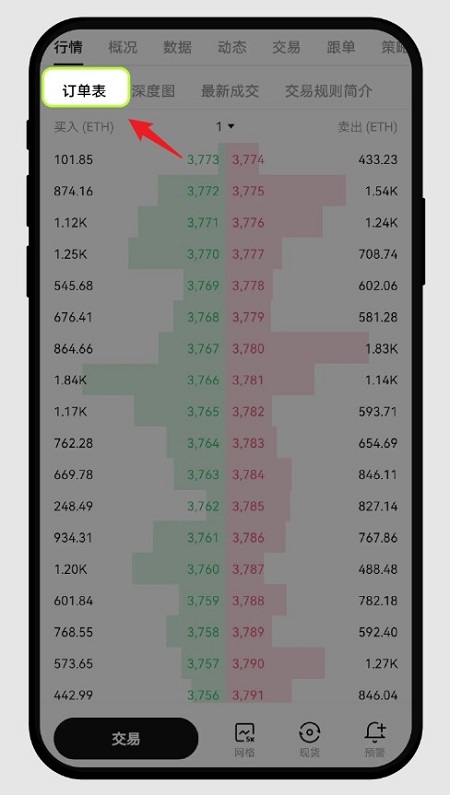 订单表:订单表左侧展示订单簿买盘在不同价位的挂单数量,右侧展示卖盘,您可以查看交易深度和不同价位的买卖双方订单数量。