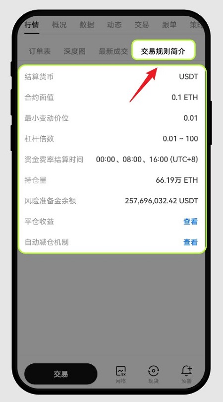 交易规则:交易规则区域详细说明了该币对的结算货币、合约面值、最小变动价位、杠杆倍数等关键信息,熟悉规则能避免因操作失误导致的损失。