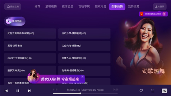 2、内置酒吧夜舞、夜店极品、百听不厌、狂欢电音、劲歌热舞等类型的DJ音乐资源。