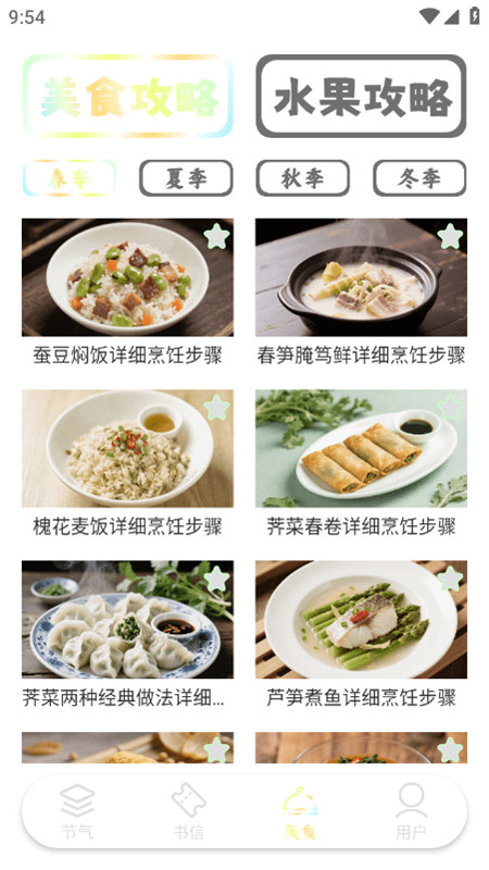 2、饮食推荐:根据节气与用户偏好,生成三餐建议,支持一键搜索食材功效,如“查询枸杞搭配禁忌”,并推送节气限定食谱视频教程。