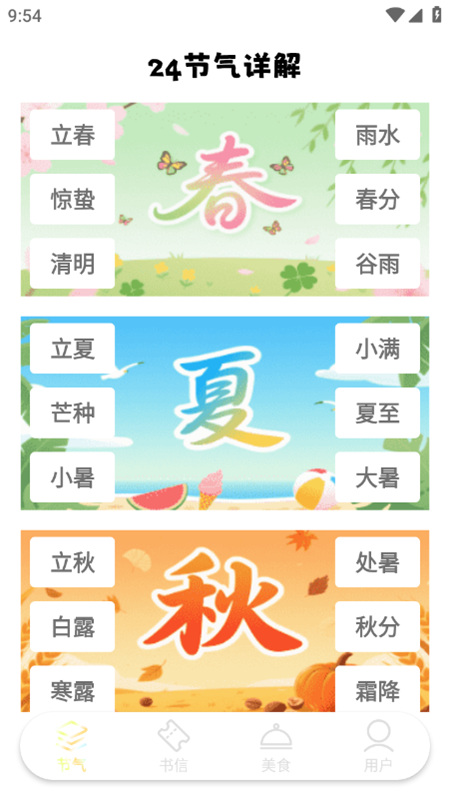1、节气日历:显示当前节气信息,包括气候特点、农事指南、民俗活动,并推送对应养生提醒,如“霜降后需防寒,建议泡脚驱寒”。