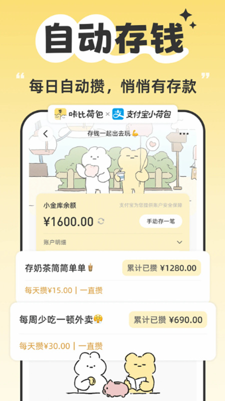 3、沉浸式储蓄目标管理:用户可设定“旅行基金”“购房首付”等储蓄目标,APP将目标拆解为每日/每周需存金额,并通过3D进度条、成就徽章等游戏化设计激励坚持。例如,完成一周储蓄目标后解锁“存钱小达人”称号,增强用户成就感。