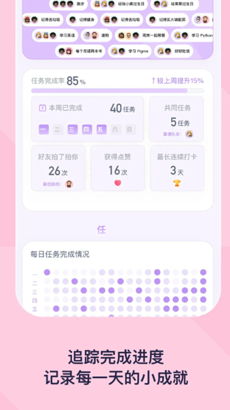 4、团队动态与成就墙:自动生成团队动态(如“成员A完成了任务X”“团队达成里程碑Y”),并在“成就墙”展示团队及个人荣誉(如连续打卡天数、任务完成数)。增强团队凝聚力,同时激励成员持续参与。