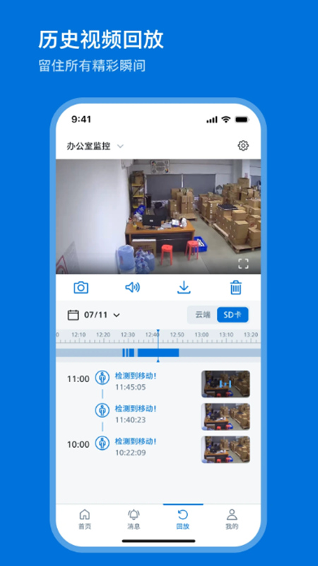 1、24小时云存储回放:提供7天/30天循环录制套餐,支持按时间轴快速检索历史视频,并可下载关键片段至本地。某用户通过回放功能,找到宠物打翻花瓶的完整过程,轻松定位责任“元凶”。