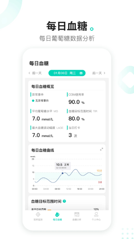 5、个性化健康管理生态:根据用户健康档案(如糖尿病类型、用药史)及实时数据,智能推荐个性化控糖方案,包含200+种食物GI值查询、运动计划定制及用药提醒功能,形成“监测-分析-干预”闭环。