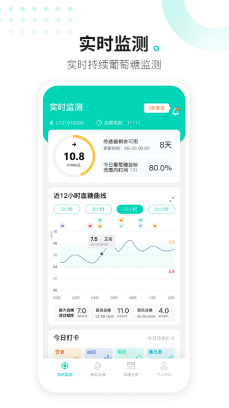 1、实时血糖监测与趋势追踪:连接传感器后,手机端实时显示当前血糖值、趋势箭头及波动曲线,支持滑动查看历史12小时数据,帮助用户直观掌握血糖变化规律。