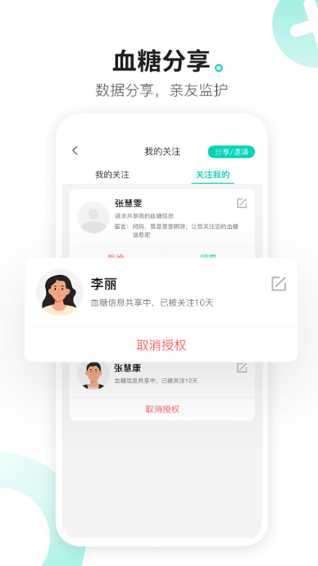 4、亲友共享与远程监护:支持一键邀请5位家庭成员或医生加入监护系统,实时查看血糖数据、异常提醒及历史报告。家属可通过APP发送关怀消息,医生可远程调整控糖方案,提升监护效率。