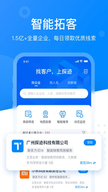探迹洞客app手机版是一款广州探迹科技推出的智能销售辅助工具,依托4000万+企业数据库和AI预测模型,为销售团队提供精准获客、客户管理、业绩分析一站式服务。