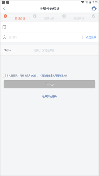 3、输入手机号和验证码进行验证,勾选用户协议,进入下一步。