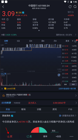 4、进入股票详情后,可看到股票的基本信息。如需买入,点击左下角的“买”。