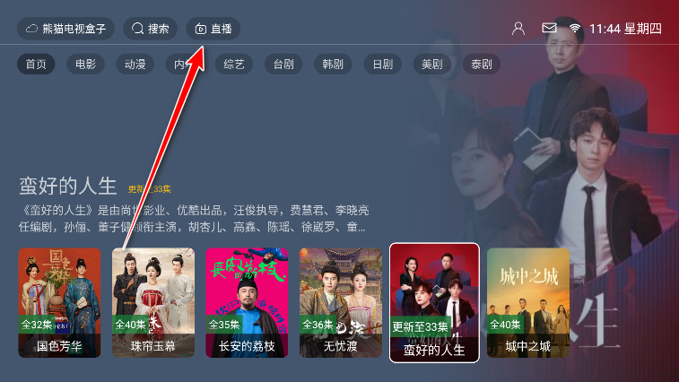 3.首页刷新后,点击直播按钮,就可以观看电视直播节目