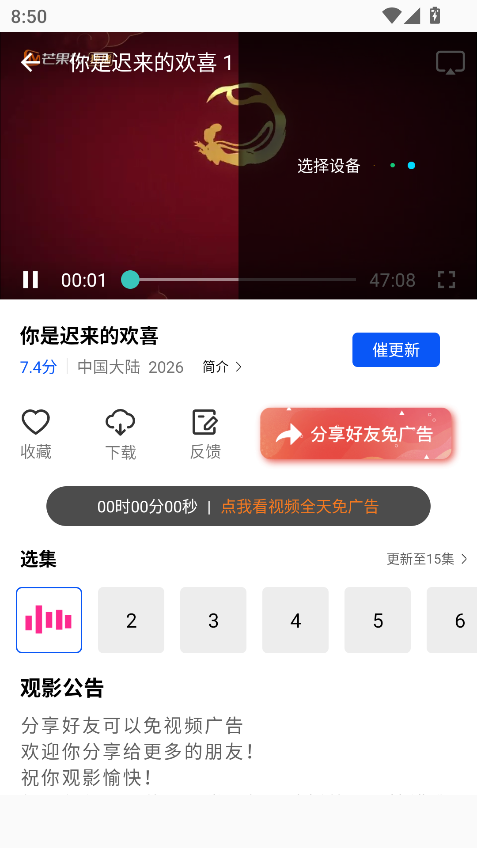 播放控制:支持选集播放、全屏模式、倍速调节(0.5x-2.0x),适配不同观影场景。