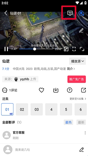 投屏操作:播放界面点击右上角小电视图标,授权悬浮窗权限后,返回软件再次点击投屏按钮,等待搜索投屏设备即可完成投屏。