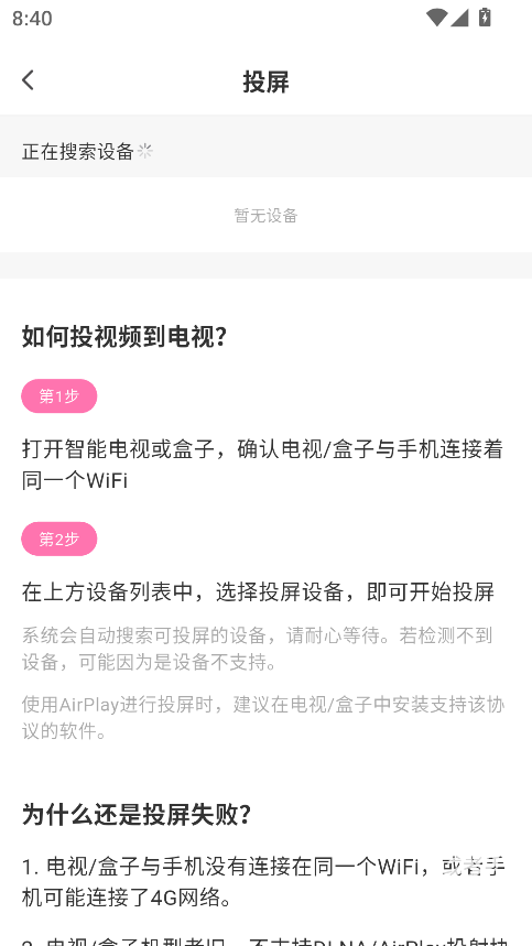 投屏功能:支持一键投屏至智能电视或投影设备,需确保手机与投屏设备连接同一WiFi,操作便捷。