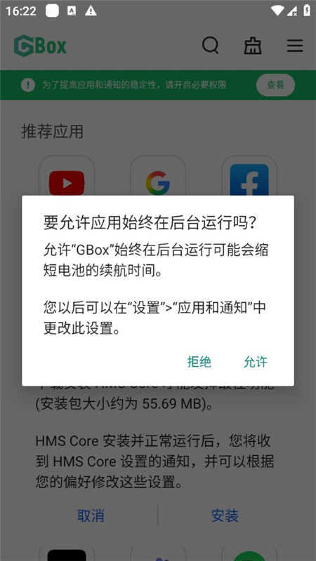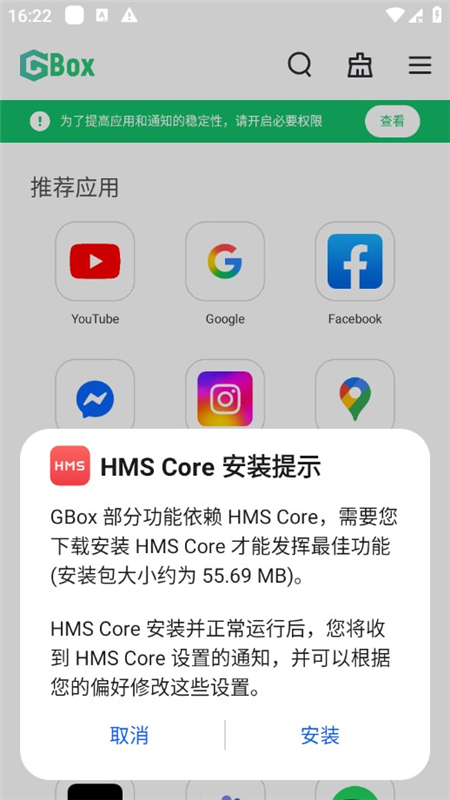1、GBox 部分功能依赖HMS Core,需要您下载安装HMS Core 才能发挥最佳功能(安装包大小约为55.69MB)。
