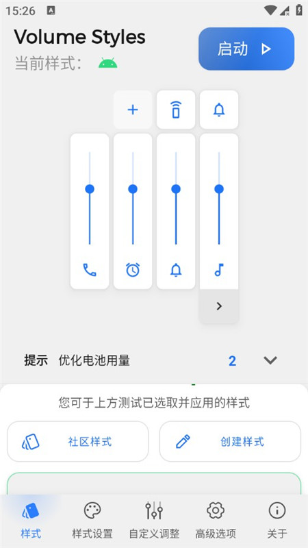 选择后可以在 App 内测试效果。点击屏幕右上角「开始」按钮,Volume Styles 便会接管音量面板。