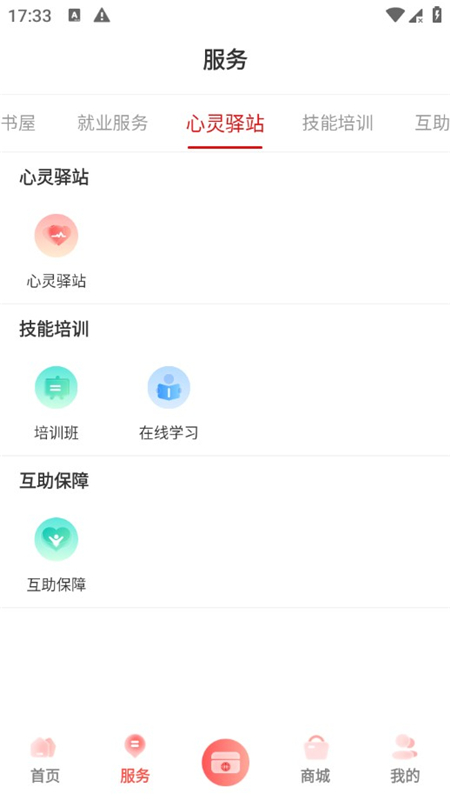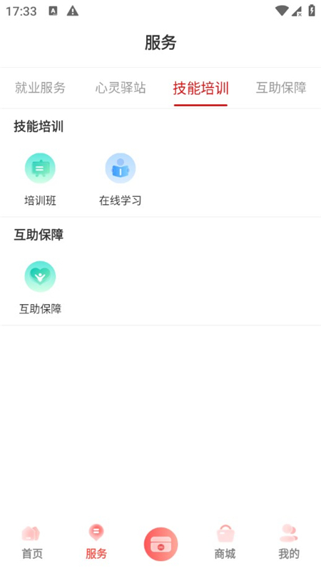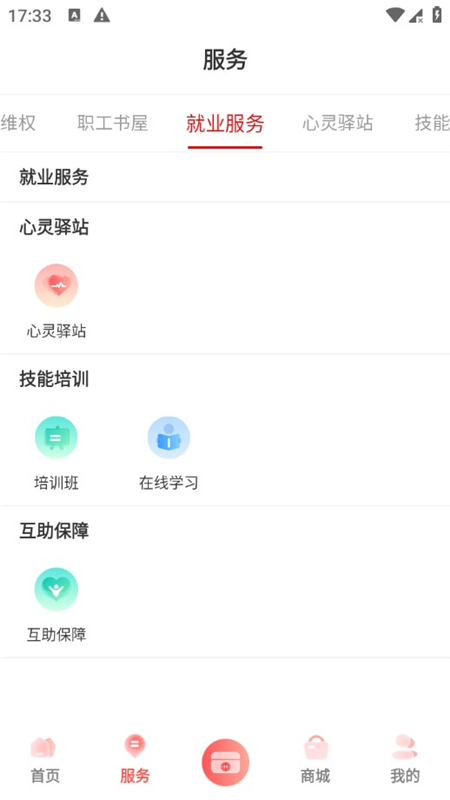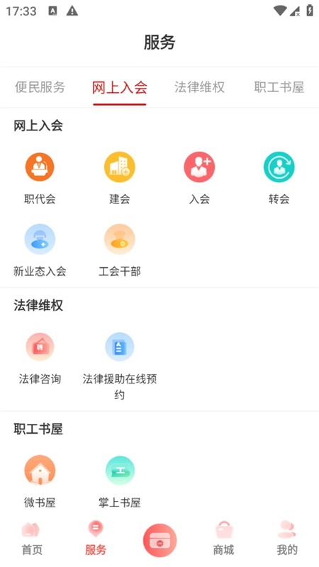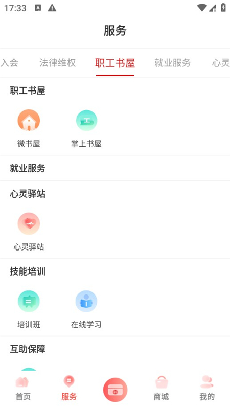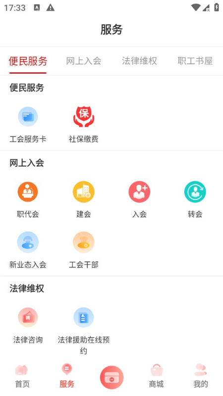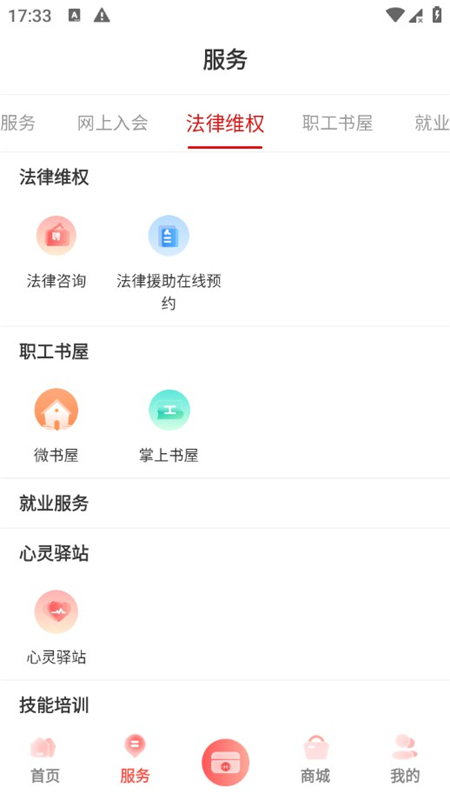 功能模块包含网上入会、法律维权、技能培训、职工书屋、就业服务、互助保障、