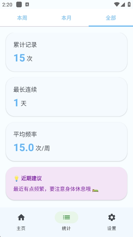 数据统计:提供周视图和月度热力图,直观展示频率趋势。