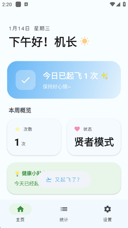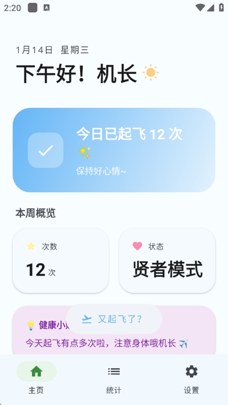撸了么APP最新版是一款根据死了么软件,突发奇想开发的一个APP,每天可以帮助机长健康的记录起飞次数,适当起飞对身体有益,请不要过度起飞,注意身体哦!