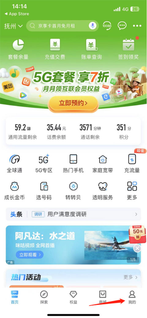 1、登录中国移动app,点击页面右下角“我的”页面。