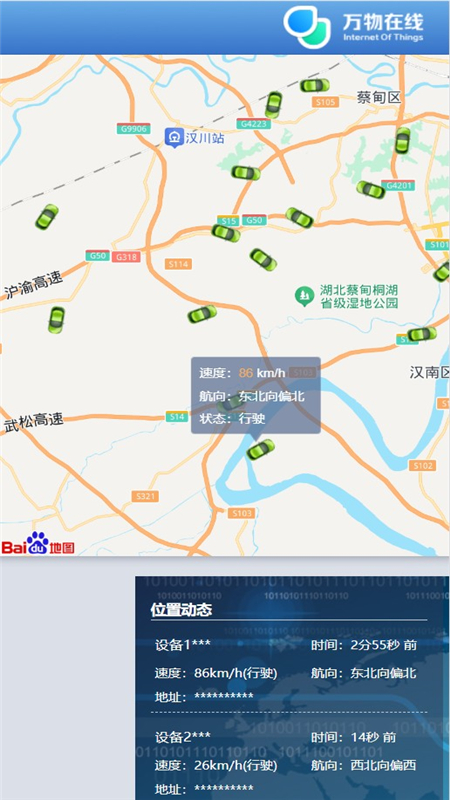 支持回放180天内行车轨迹,显示速度、航向、停留时间等