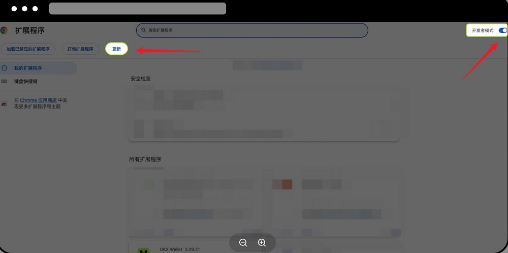 2.在插件管理页面打开【开发者模式】,点击【更新】进行自动更新。
