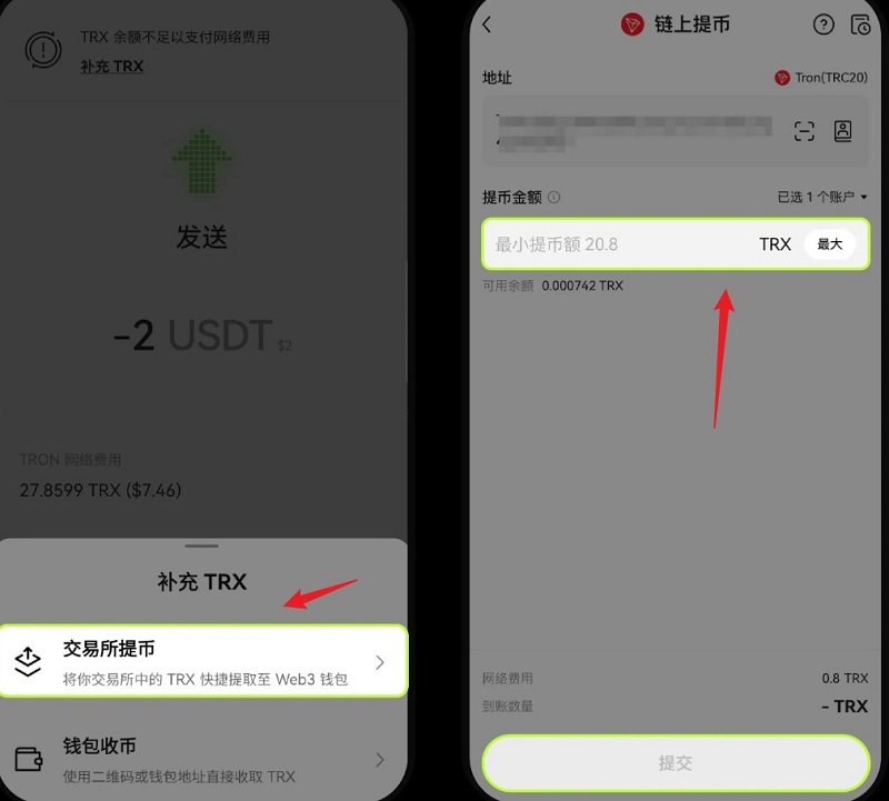 若您的交易所账户已有该资产,可直接通过【交易所提币】选项快捷补充手续费。