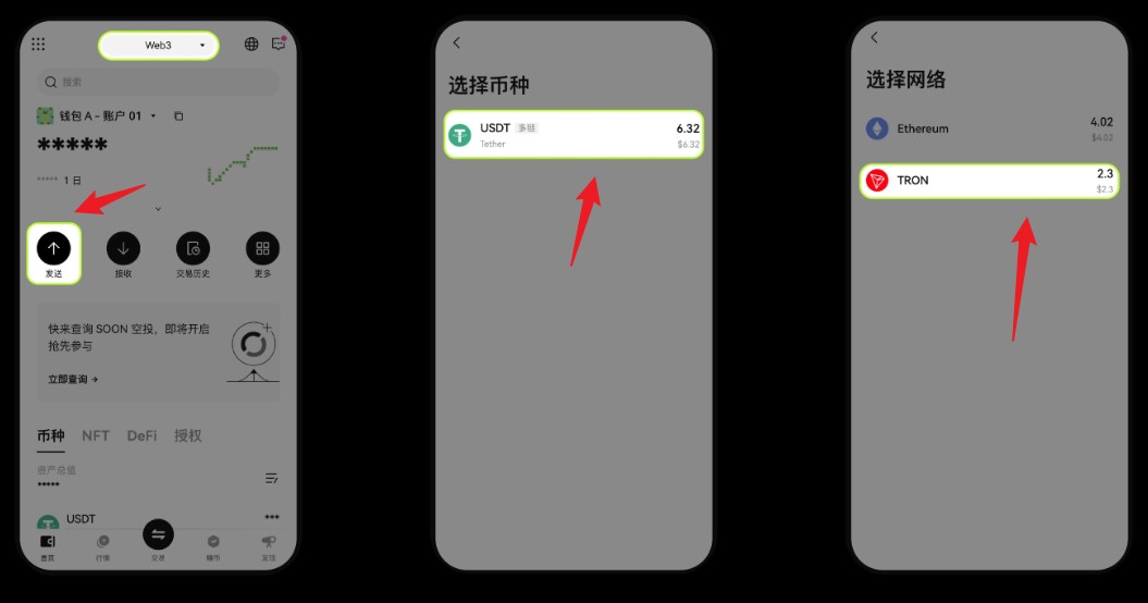 在钱包首页点击【发送】,选择币种和网络,以 USDT 为例,选择发送 TRON 网络上的 USDT。