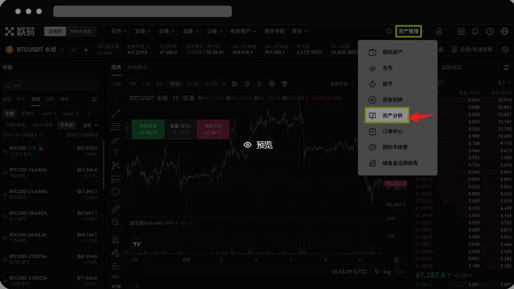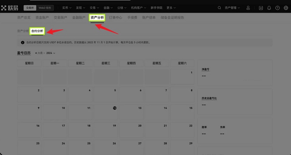 1、在交易页面中点选【资产管理】-【资产分析】-【合约分析】