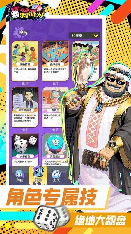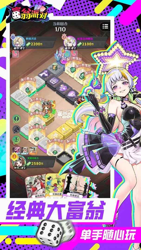 富翁派对游戏官方正版是一款融合了策略与运气元素的大富翁卡牌对战游戏。最多支持三名玩家参与激烈的对抗,在游戏中,玩家需巧妙运用所选角色的独特技能及手中卡牌,通过资源管理、行动决策和事件应对来争夺财务优势并最终取得胜利!