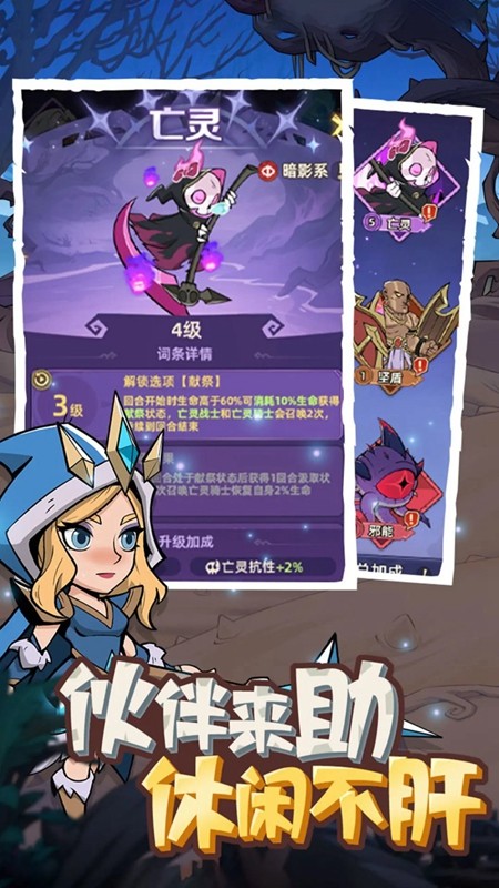 1.冒险卡牌放置机制:作为一款冒险卡牌放置类手游,玩家可轻松管理自己的队伍,享受自动化战斗带来的便捷,同时通过收集和升级各种强大的角色卡牌来增强实力。