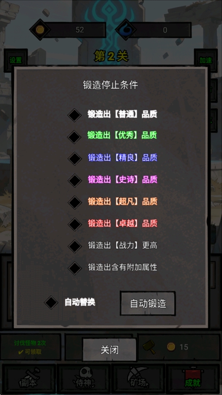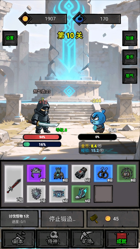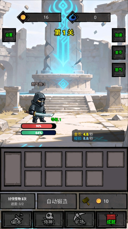 2.资源双向获取:资源获取分为 “主动征战”与 “被动经营”两大模块。征战副本可快速获取大量金币;经营矿场则能持续挖掘晶矿,用于稀有道具兑换,且矿场等级可通过金币升级,平衡两种获取方式,让玩家有更多的发展策略。