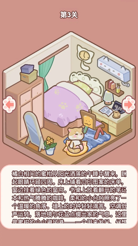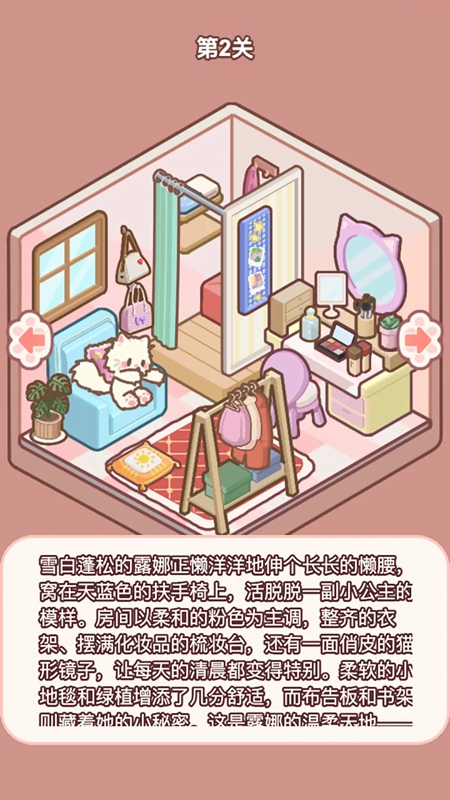 1.自由摆放创作:玩家可以自由地将家具和猫咪摆放在房间中,发挥创意打造出个性化的空间布局,满足不同审美需求。