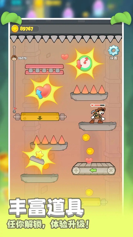 3.收集道具与金币系统:冒险过程中可收集各类有用道具及金币,道具能帮助玩家更好地应对陷阱和难题,金币则用于购买更多道具、装备或进行角色升级。