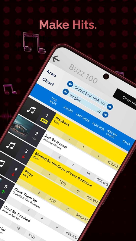 2.策略性的图表战斗:制定策略,在4个地区和3种发行类型的12个排行榜上竞争排名,通过合理的规划和努力攀登榜单前列,体验真实的音乐市场竞争的激烈程度。