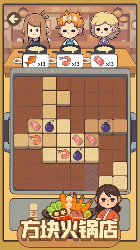 方块火锅店游戏2025最新版是一款融合俄罗斯方块消除机制与模拟经营玩法的休闲游戏。玩家扮演火锅店老板,通过拖拽俄罗斯方块状的食材积木到棋盘中,凑齐整行/列后触发消除,为顾客提供所需食材以通关!