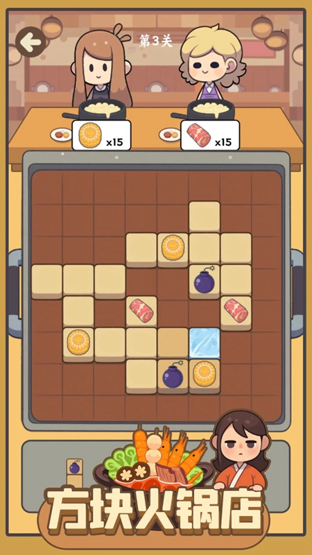 3.棋盘空间策略性:在限定方格内布局食材积木,考验玩家的空间规划能力,填满一行或一列即可消除并获取顾客需要的食材。
