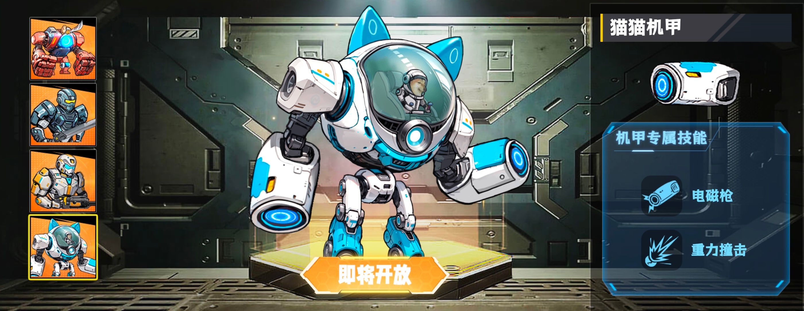 进度:目前显示 “即将开放”,专属技能是电磁枪 + 重力撞击,蹲个后续解锁!