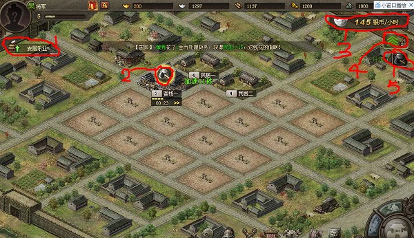 玩家扮演主公,建立主城,升级农田、伐木场、矿场等资源建筑,保障军队发展。
