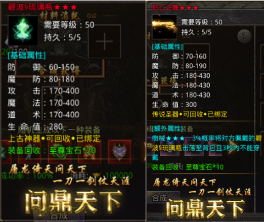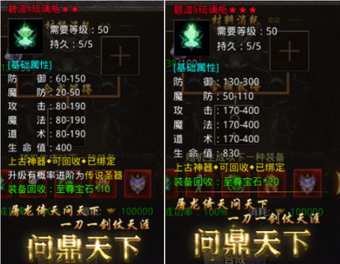 下图为3阶神器与3阶圣器(同部位)的基础属性对比,圣器除基础属性比同阶神器高外,还多了个“缴械”的特技,效果是概率击落对手同部位的神器(包括低阶圣器)且3秒内不能穿戴。这效果可是相当强大,若对战时触发效果,无论是击落对手的琉璃瓶使其吸血的套装效果失效,还是击落其玲珑塔导致不能复活,都能令自己处于优势。
