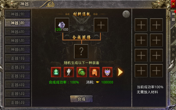 在庄园(从传送员处进入)中,可在神界使者处(见下图),消耗一些材料合成更高级别的神器,合成必定成功,但生成的神器的类型是随机的,合成公式如下: