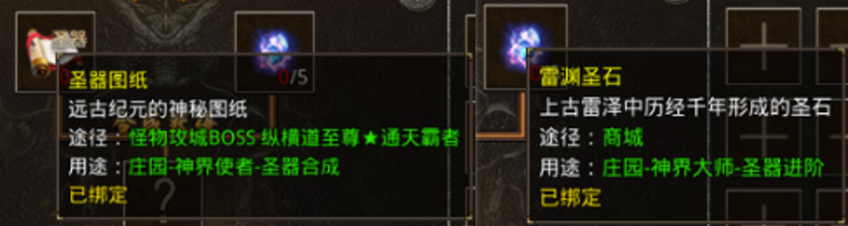 1.纵横道至尊·通天霸者或其被击杀后引起的怪物攻城中的boss,都有概率掉落“圣器图纸”,加上由商城购买获得的“雷渊圣石”,可在庄园的神界使者处合成3阶圣器(1段),此后合成4-8阶圣器(2-6段)与神器部分类似,只是材料更加难以获得。